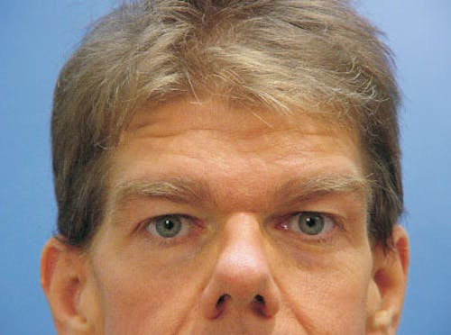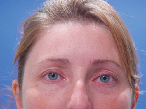 - A drooping brow that partially obscures the eyes and upper lids